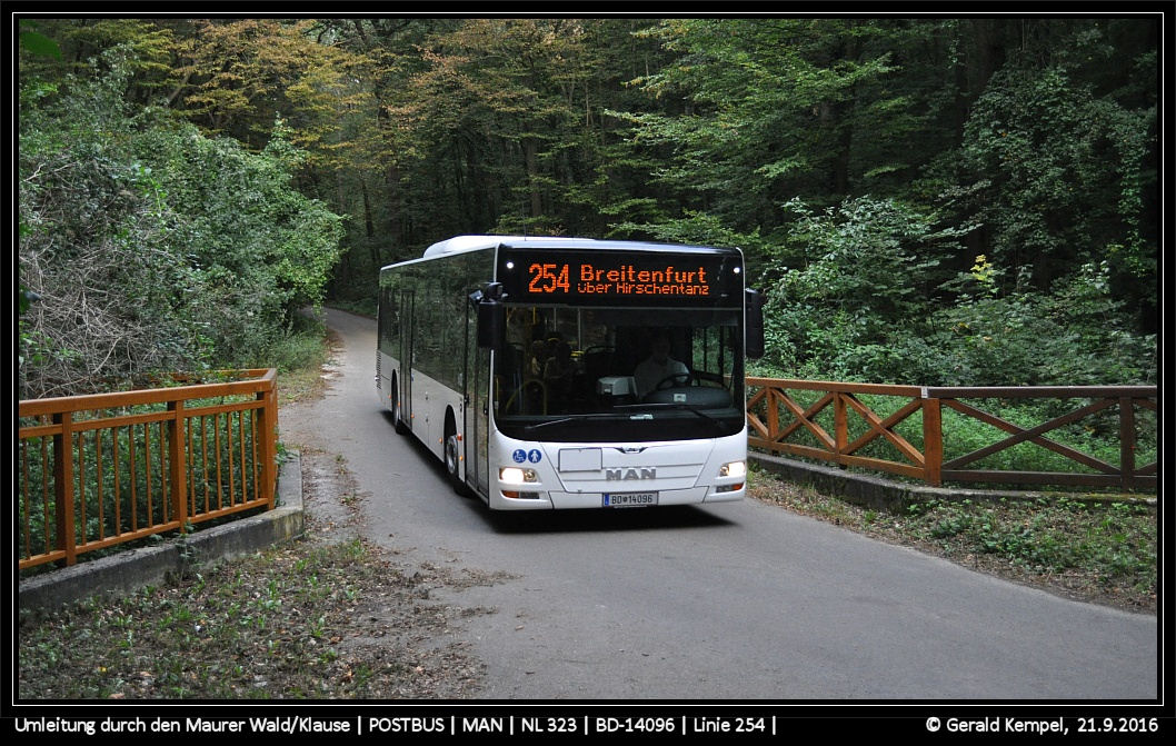 - BD-14100 an der bereits gezeigten Engstelle in Kalksburg mit ungeduldigem Radler im Hintergrund, der anscheinend nicht