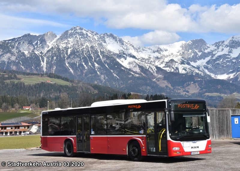 - der Postbus MAN NL 323 BD-14106 bei der Überstellungsfahrt von Vösendorf nach Innsbruck beim Wilden Kaiser in Söll bzw. Going