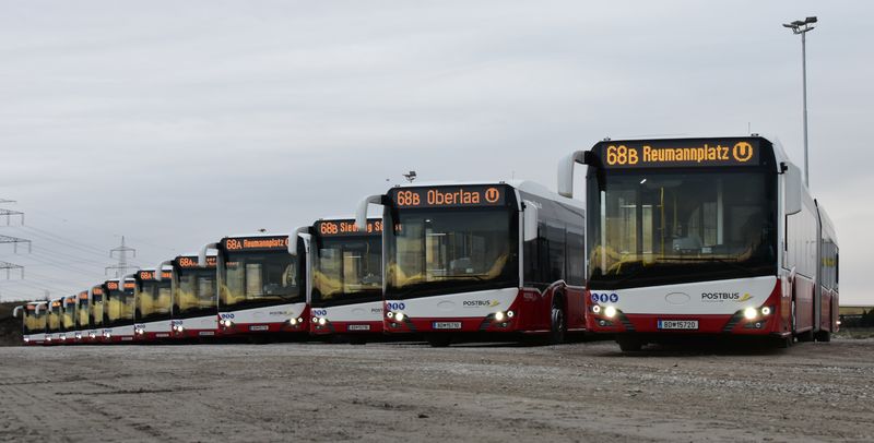 - Parade aller 12 Solaris Urbino 18 Gelenkbusse für die Linien 68A/B. Dieses Foto war nur ganz kurze Zeit wenige Stunden vor der Betriebsaufnahme und somit einmalig möglich.