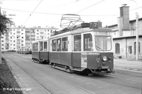 Ein Bild eines im Remisengelände abgestellten Zweiwagenzuges der Linie 7.