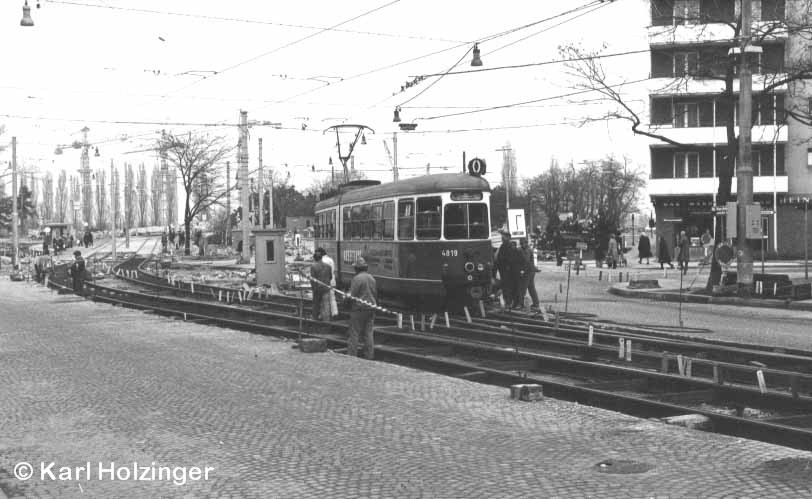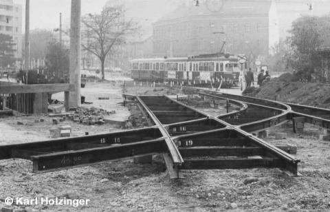 Baubeginn aufgenommen und zeigt im Hintergrund einen Zug der Linie132 noch