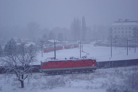 der S 80 Brücke aus gesehen. Im Vordergrund am Verbindungsgleis eine ÖBB