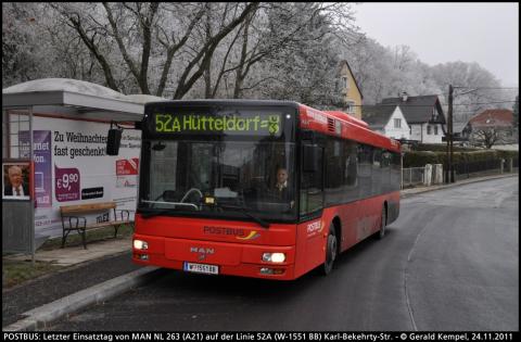 CameraNIKON D5000Exposure1/500sExposure ModeAutoExposure ProgramNot DefinedFlashFlash did not fire, auto modeFocal40mmMakeNIKON CORPORATIONOrientationHorizontal (normal)Scene ModeStandardWhite Balance ModeAutoF-Number53/10Metering ModeMulti-segmentDateigröße332140Breite1004Höhe727 - [stvkr-a-fotos] [PT/W] Die letzten Fahrten der roten Postbusse am 52A und 52B