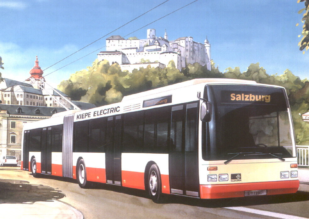 Die Abbildung (von KIEPE ELEKTRIK) zeigt eine Zeichnung des neuen Salzburger Gelenkobus Van Hool AG 300 T. Bilder des ersten Wagens 0061 folgen demnächst.