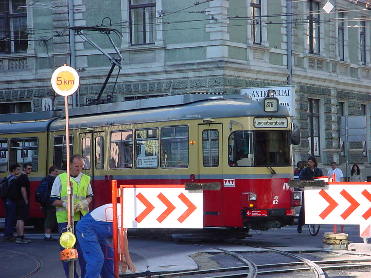 SL STB fährt über die neuerrichtete Gleiskreuzung am Westende der Anichstr Richtung Bergisel (nur vorne korrekt beschildert) in die Bürgerstr ein.