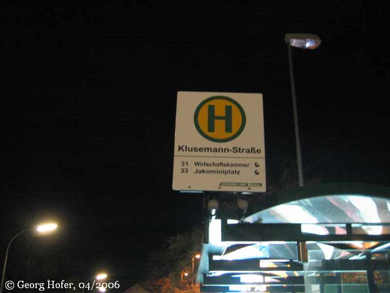 Haltestellentafel "Klusemann-Straße". Siehe