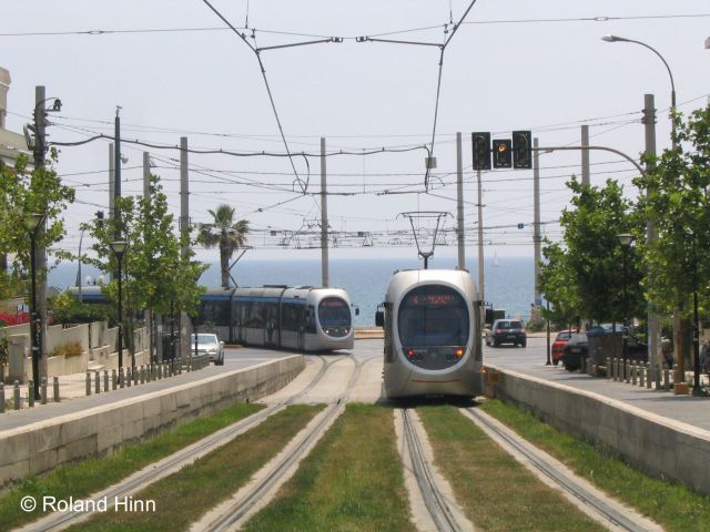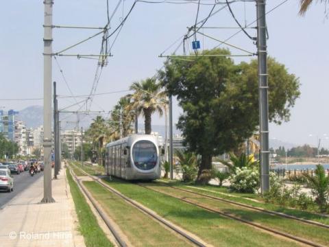 entlang der Küste nach Kolimvitrio, rechts Richtung Faliro. Straßenbahn mit