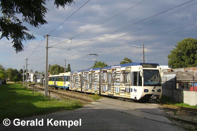 Bahnübergang Sobotagasse und zeigen den "IKEA-Zug" 4-109 + 402, sowie