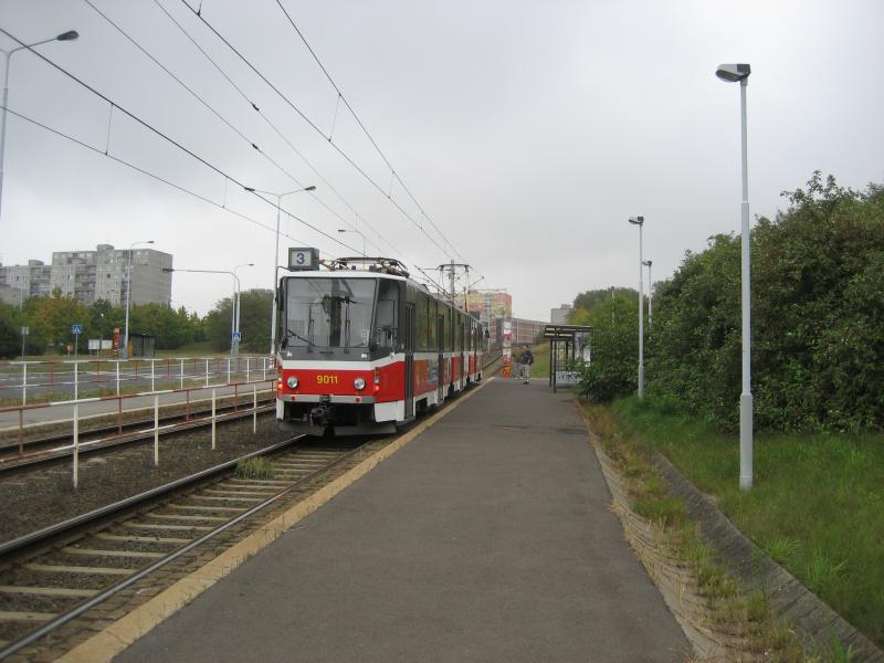 das zweite zeigt einen Tatra-Zweirichtungswagen auf der Linie 3 bei der