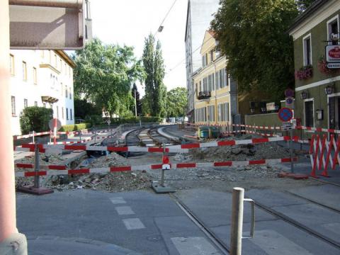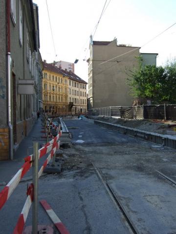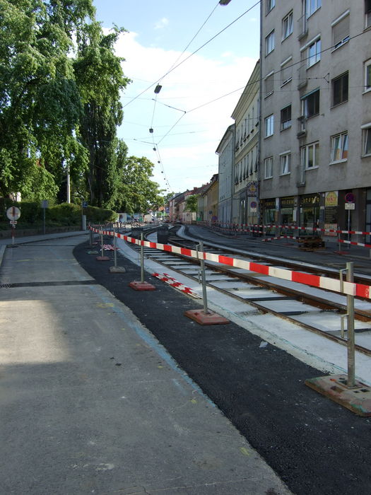 der noch bestehenden Gehsteigkante links (wie auch an der Oberleitung