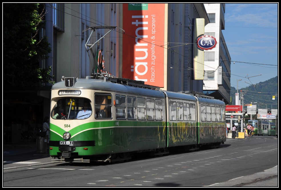 Mélange aus Ex-Lohner- und Ex-Wuppertaler Wagen 584 auf Linie 1; die