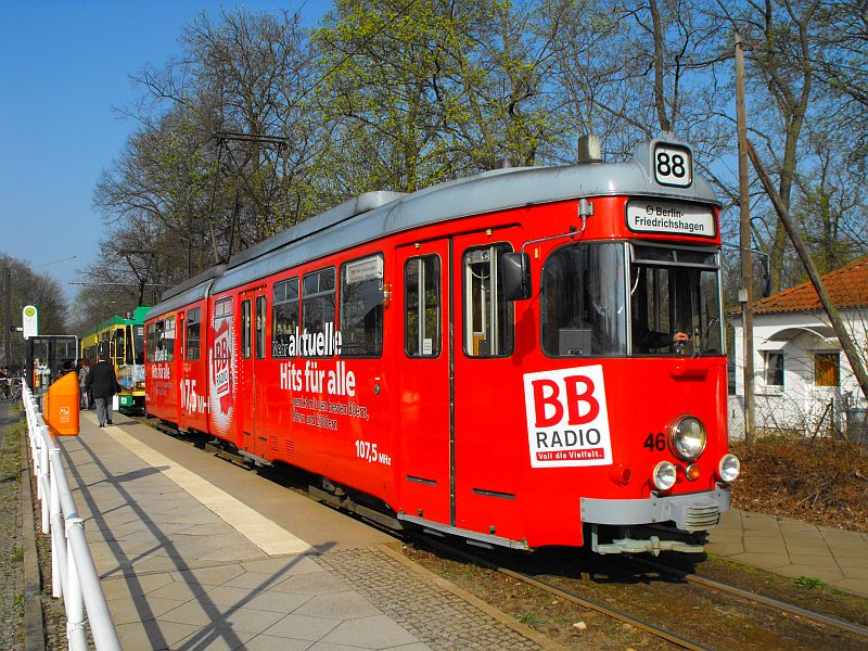 # April: Tw 46 der Straßenbahn Schöneiche hat eine rote Vollwerbung
