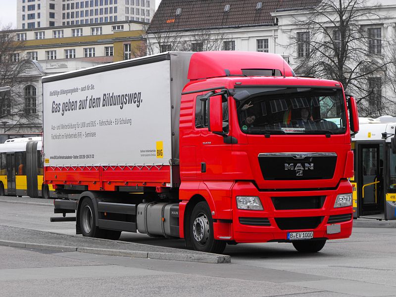 Fahrschulwagen ist dieser rote MAN TGX 18.360. Die beiden Damen im