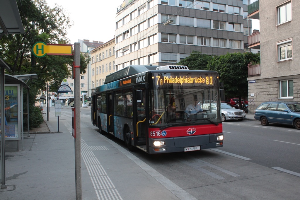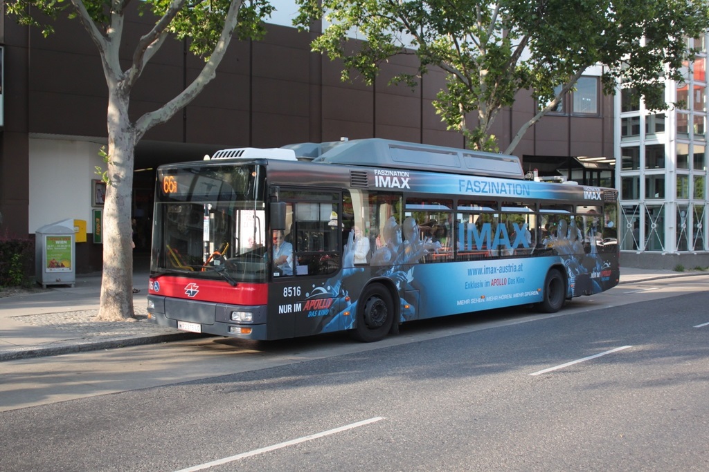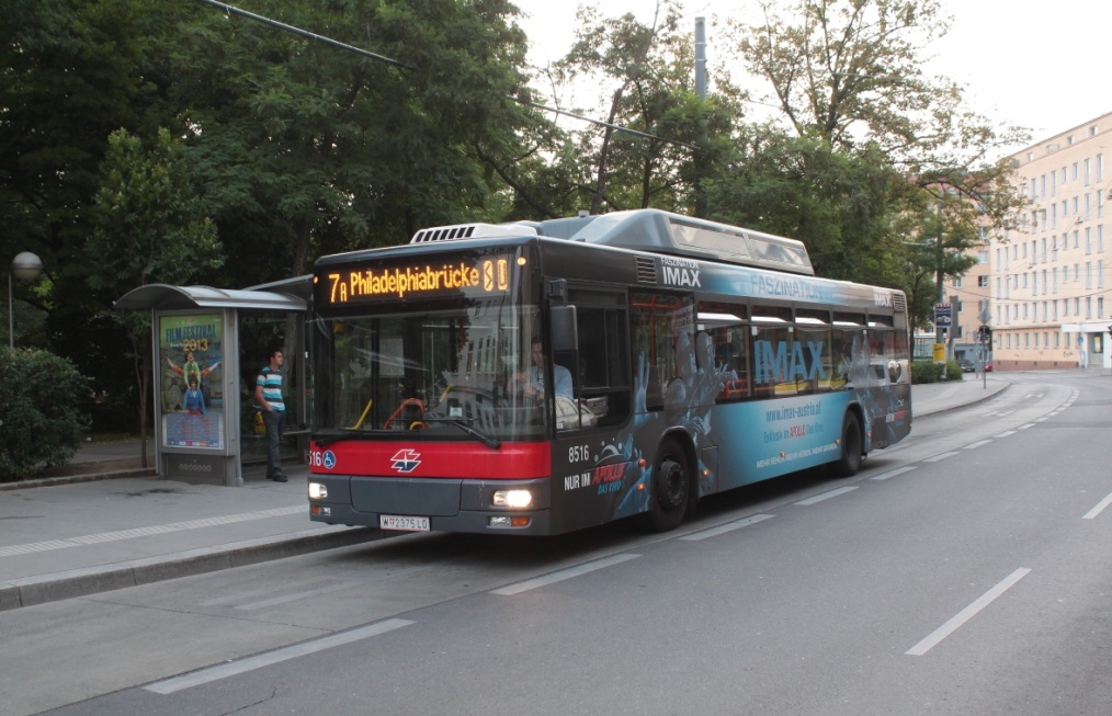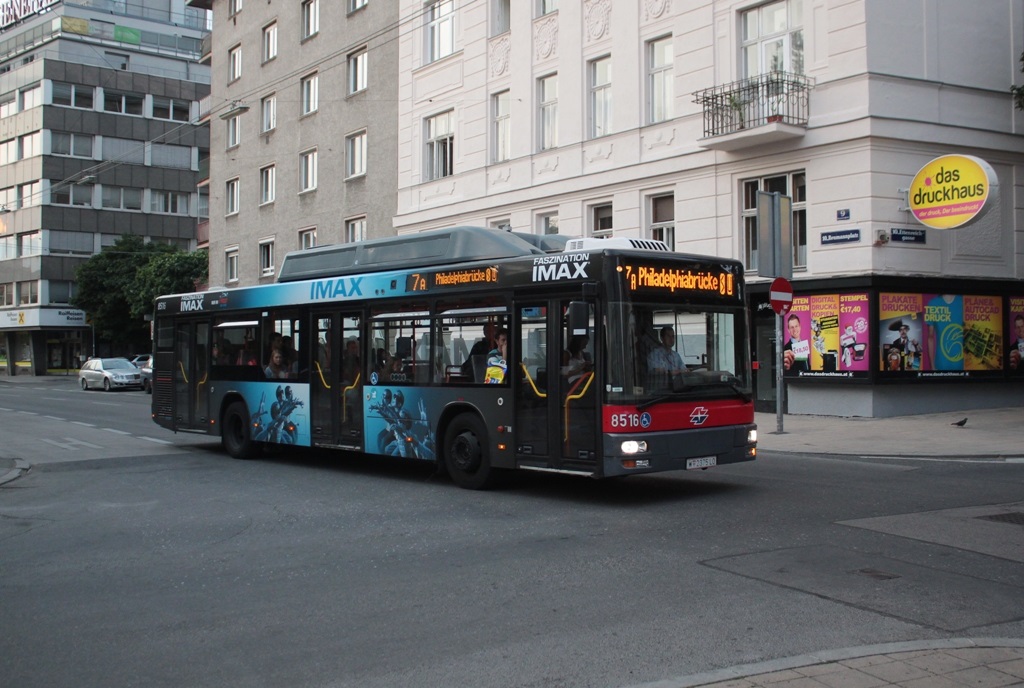 Der Werbebus 8516 ist ein Normalbus der Garage Raxstraße.