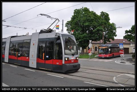 - Begegnung vom B1 Nr. 707 und dem bereits in der Anfangsstation Gallgasse wartenden NL 273/T3 Nr. 8671.