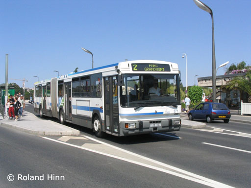 Bild verlässt der Renault-Gelenkbus Nr. 371 die, in Straßenmitte angeordnete