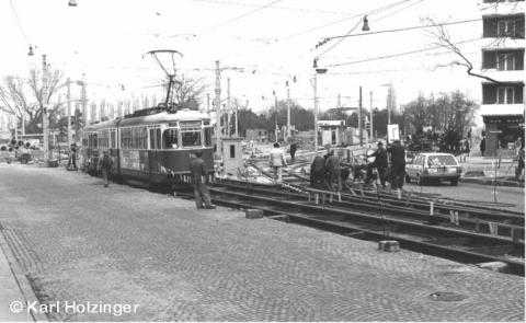 Baubeginn aufgenommen und zeigt im Hintergrund einen Zug der Linie132 noch