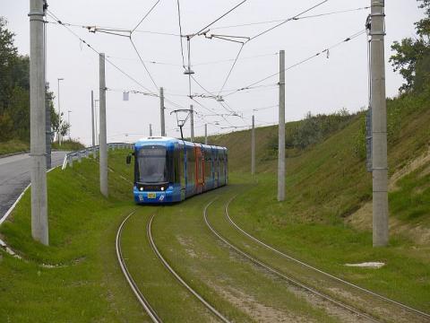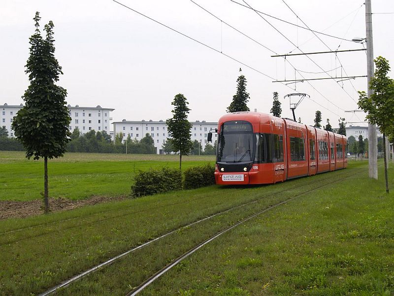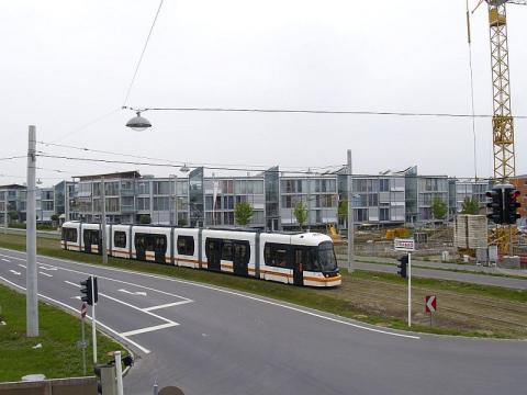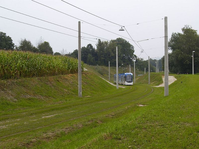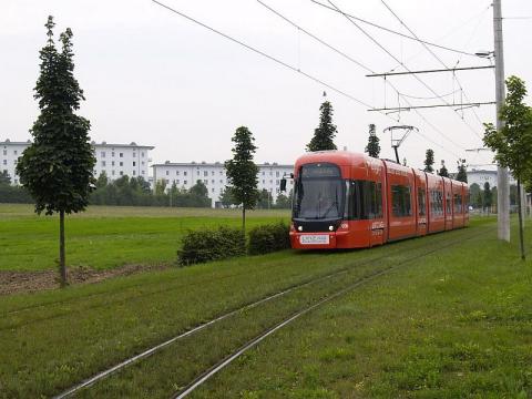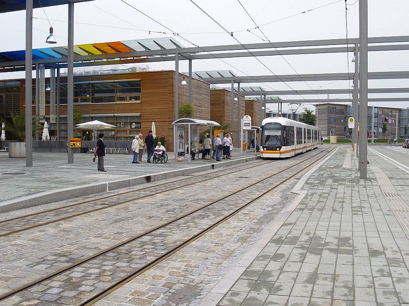 französische anmutenden Tramwaystrecke - wenn nur die Masten nicht so brutal
