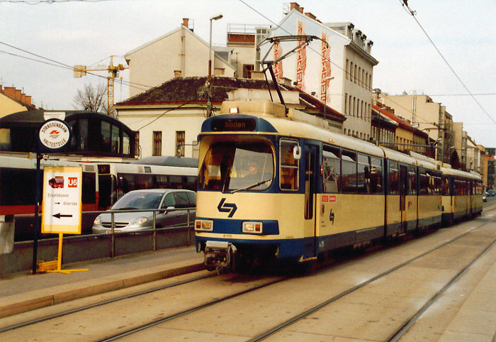 Philadelphiabrücke passiert soeben der Wagen 4-115 der Wiener Lokalbahnen AG