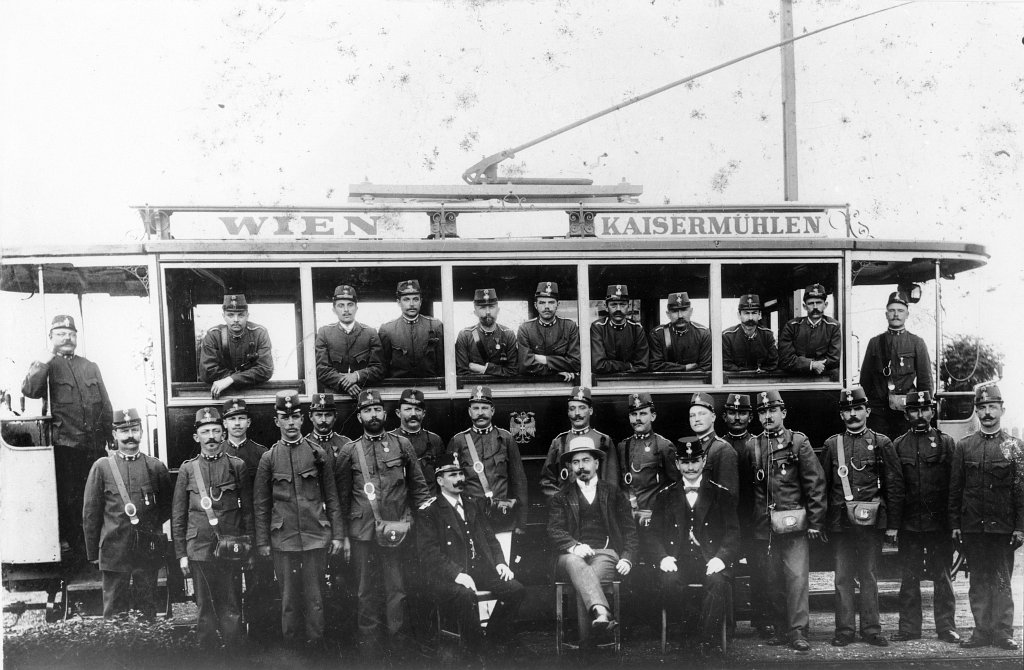 Es zeigt einen guten Teil der Belegschaft der Elektrischen Bahn Wien -