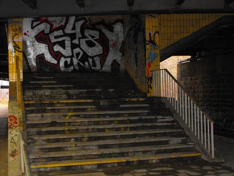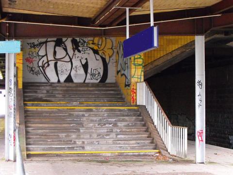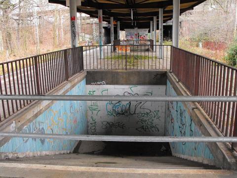 den unteren Bahnsteig, den vermauerten Tunnelzugang zur Bahnhofshalle und
