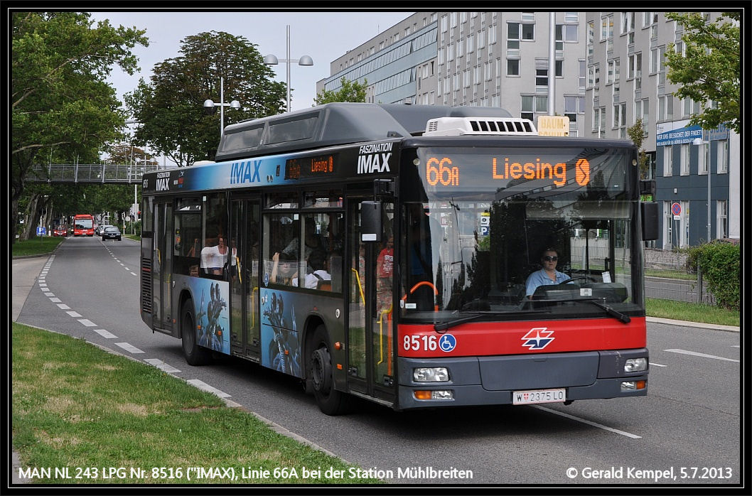> Der Werbebus 8516 ist ein Normalbus der Garage Raxstraße.