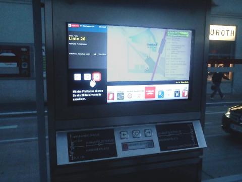 ein Bedienfeld mit Monitor und Tasten für Infos, Werbung und Umgebungsplan.