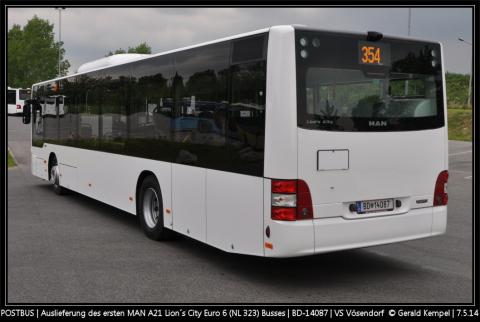 Die exklusiven Fotos zeigen den nagelneuen MAN NL 323 (A21) - Euro 6 Bus BD-14087 in der Verkehrsstelle