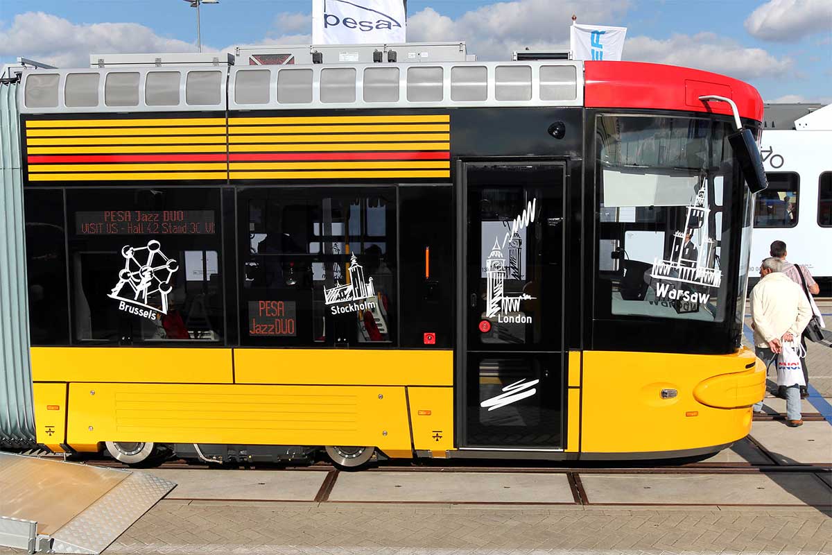 An Straßenbahnen waren u.a. zu bewundern: die Stadler Straßenbahn für Minsk, die neue Straßenbahn von Pesa für Warschau oder ein Tw300 für Hannover.