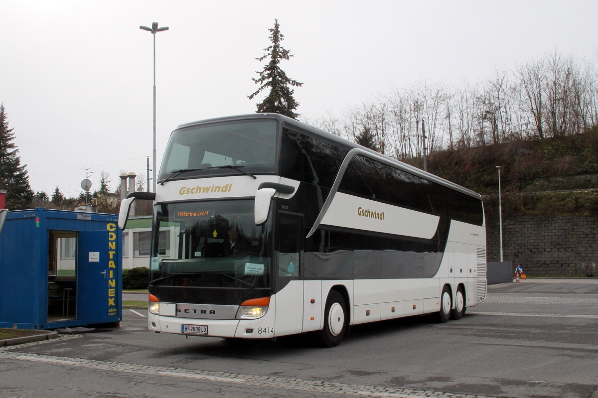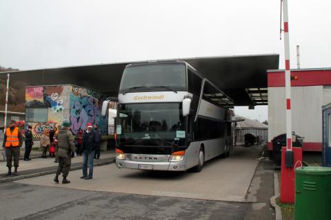 Es zeigt 2 Doppelstockbusse von Gschwindl am Grenzübergang Spielfeld,