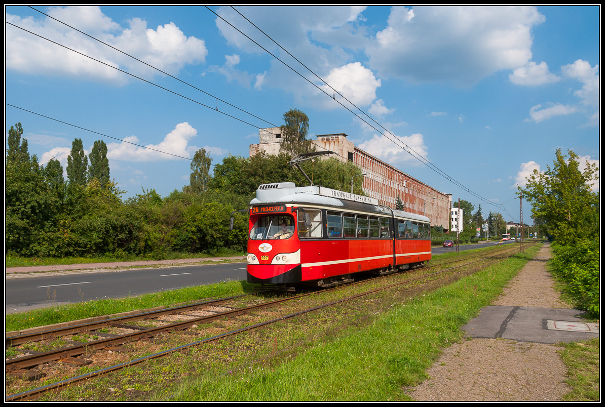 hinter Wagen 927 nächst der Haltestelle Osiedle Wanda schwebt.