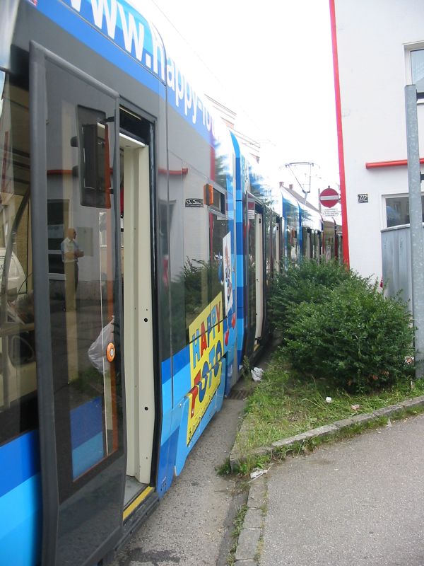 Dann noch der wirklich enge nicht-Haltestellen-Gehsteig, an dem die Bim nach