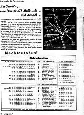 Hier ein Übersichtsplan des Autobusnachtverkehrs aus der Zeitschrift Ring-Rund vom 1. Februar 1957. Im zweiten Bild ein Fahrschein des Autobusnachtverkehrs.