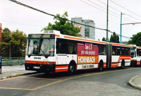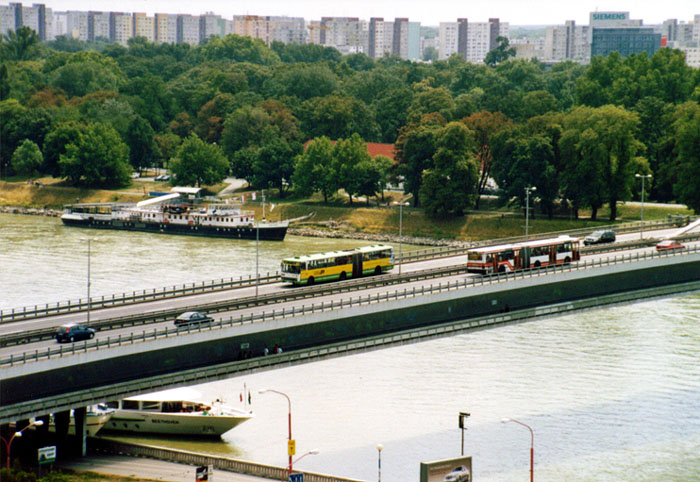 Ikarus 435.18, die sich soeben auf der imposanten Donaubrücke begegnen.