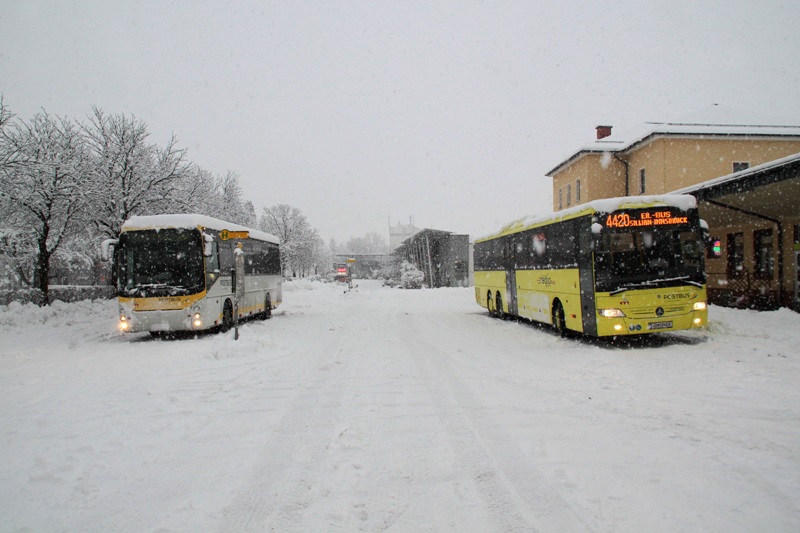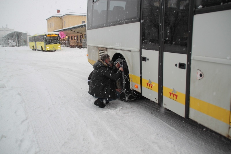 An einem wurden gerade Schneeketten (mit Hilfe einer Zivilperson) angebracht,
